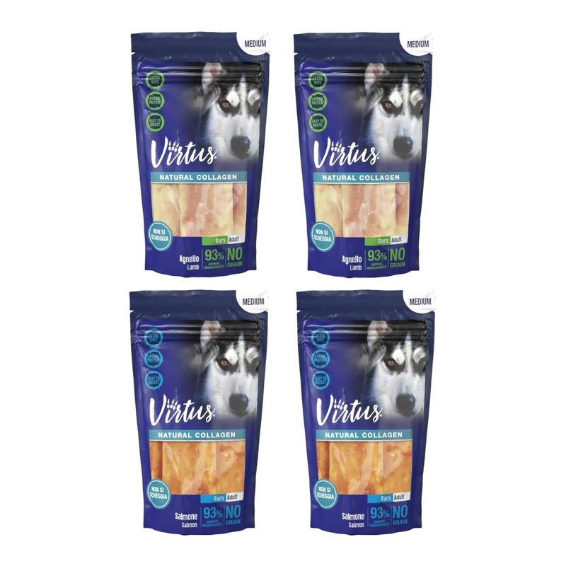 Offri al tuo cane di taglia media uno snack gustoso e benefico: scegli il Set Prova Multigusto 4x90G Virtus Medium Dog Natural Collagen Bars e rendi ogni morso un gesto d’amore!