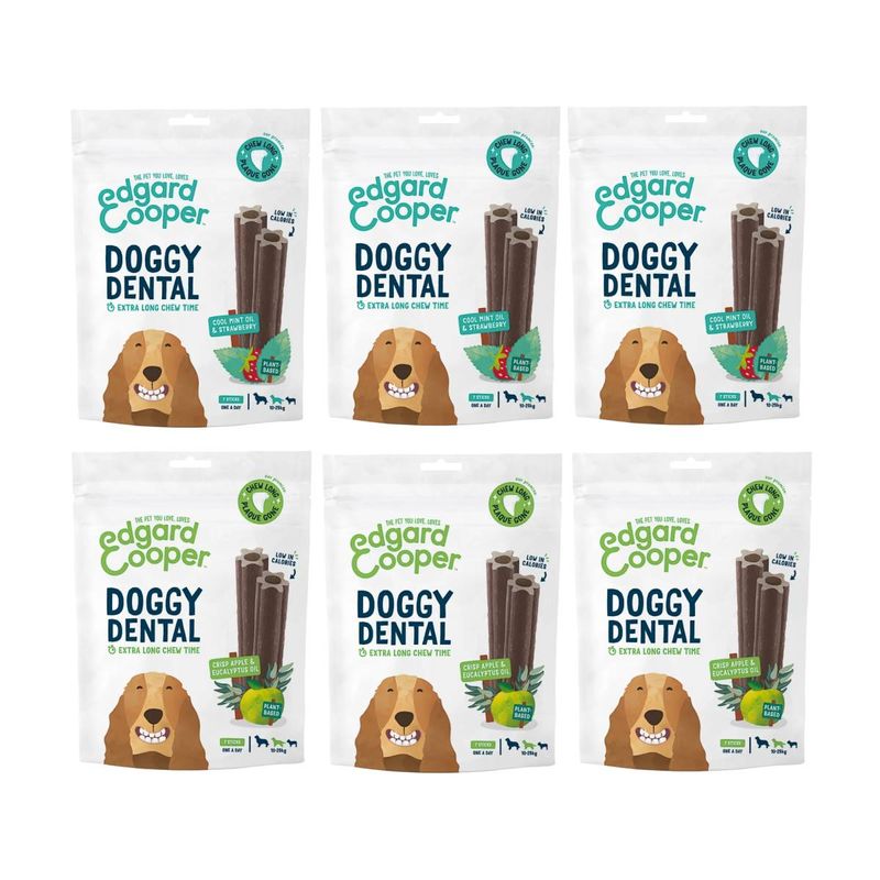 Offri al tuo cane una bocca sana e fresca con il Set Prova Multigusto 6x240G Edgard & Cooper Snack Doggy Dental Medium: uno snack naturale che si prende cura della sua igiene orale con gusto e freschezza!