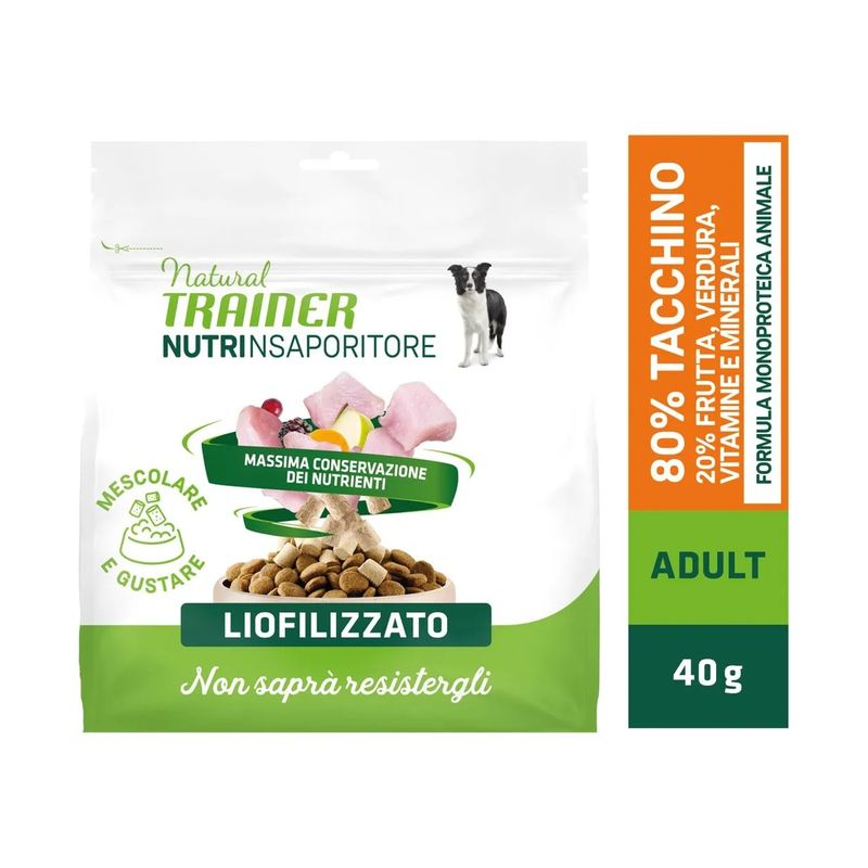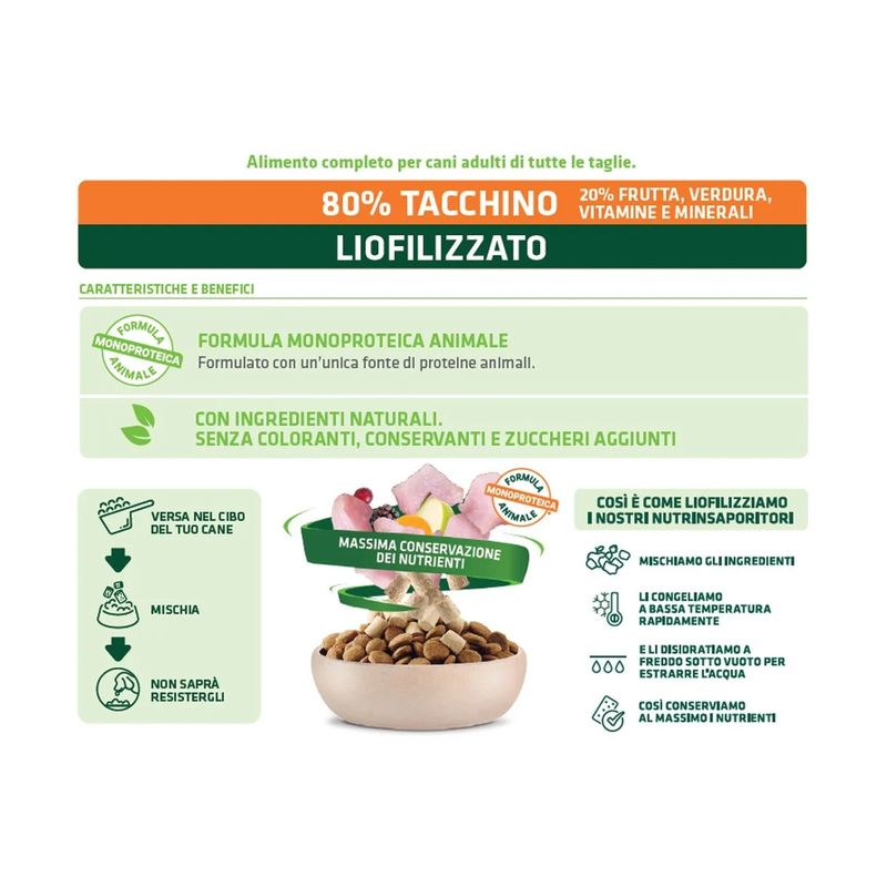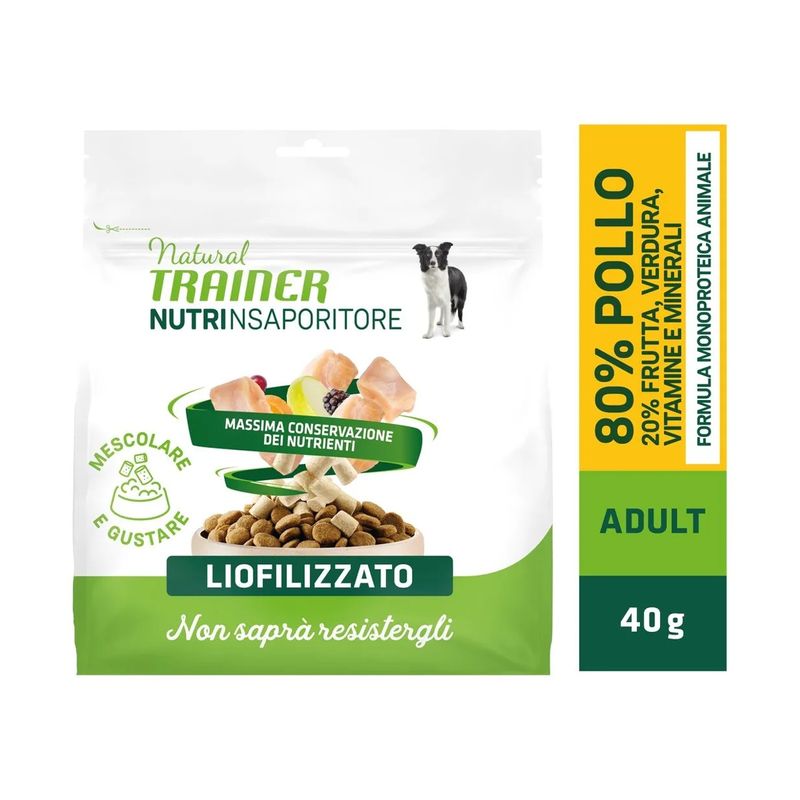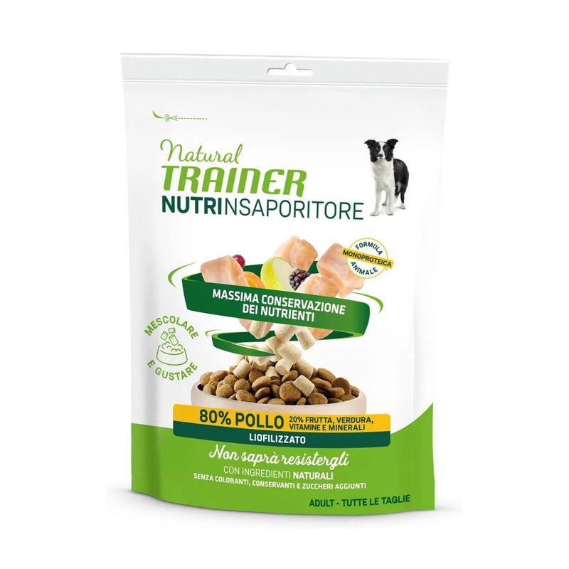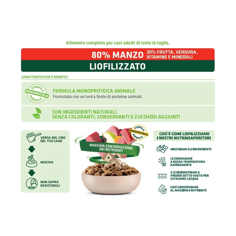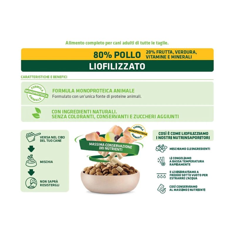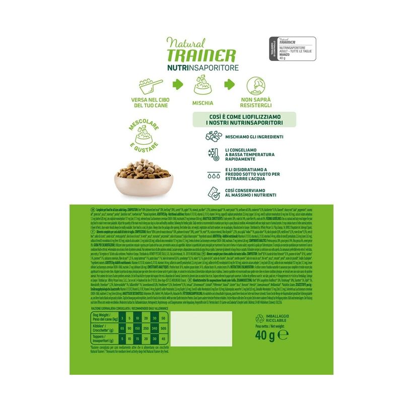 Il Set Prova Multigusto 6x40G Natural Trainer Dog NutrInsaporitore è un insaporitore formulato al 100% carne liofilizzata, sano e naturale dedicato al tuo cane adulto. Formulato con un’unica fonte di proteine animali. Contiene l'80% di carne e il 20% di frutta, verdura, vitamine e minerali, indispensabili per la salute del tuo amico peloso. Con ingredienti naturali, senza coloranti, conservanti e zuccheri aggiunti. Il processo della liofilizzazione avviene cosi: si tagliano tutti gli ingredienti presenti nella ricetta, dopo vengono congelati a bassa temperatura rapidamente, successivamente vengono disidratati a freddo sotto vuoto per estrarne l'acqua. Facendo così si conservano tutti i nutrienti degli ingredienti. Questo insaporitore è un modo per rafforzare il legame tra te e il tuo amico peloso. Può essere usato come ricompensa o come coccola tra un pasto e l’altro.