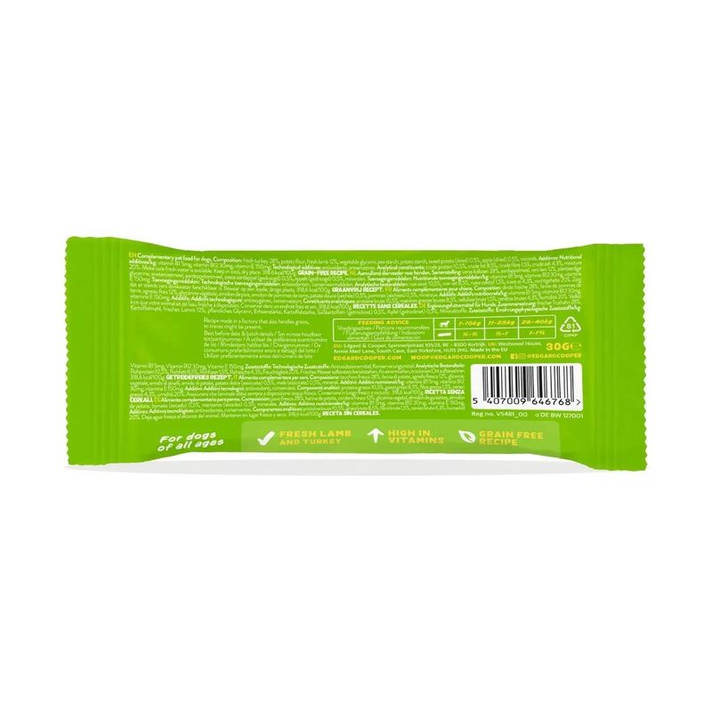 Delizia il tuo amico peloso con il gustoso Set Prova Multigusto 8x30G Edgard&Cooper Snack Cane Barrette, un'espressione tangibile dell'amore e dell'impegno di Edgard Cooper nel garantire il benessere dei nostri compagni pelosi. Le deliziose barrette sono più di uno snack per cani, sono un invito a condividere momenti preziosi, a imparare insieme a rafforzare il legame unico che ci unisce al nostro amico peloso. Realizzati con carne fresca di alta qualità proveniente da allevamenti che rispettano il benessere animale, che non solo delizia il suo palato, ma lo nutre con proteine di alta qualità e vitamine essenziali provenienti da ingredienti naturali. Questa prelibatezza priva di cereali e a basso contenuto calorico è la scelta ideale per premiare il tuo cane senza compromettere la sua linea. Grazie alla loro formulazione leggera e altamente digeribile, potrai offrire al tuo fedele amico tutto l'amore e l'attenzione che merita, senza doverti preoccupare della bilancia.