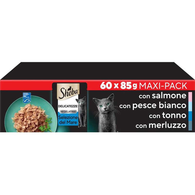 Con Sheba Delicatezze Cat Busta Mix Pesce, offri al tuo amico peloso un'esperienza culinaria di lusso, ricca di sapori deliziosi e ingredienti di prima qualità. Non c'è niente di meglio per dimostrare il tuo amore al tuo gatto che viziandolo con Sheba, un marchio dedicato a offrire il meglio in termini di cibo umido per gatti.