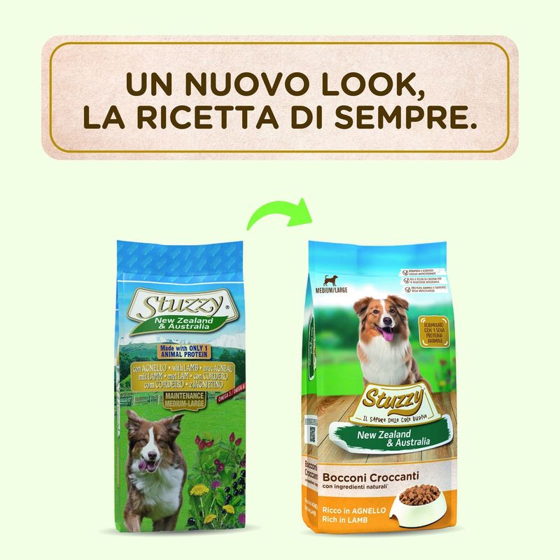 Stuzzy New Zealand&Australian Medium e Large Agnello si rinnova con nuovo pack. Potresti ricevere il nuovo o il vecchio pack in base alle disponibilità a magazzino.