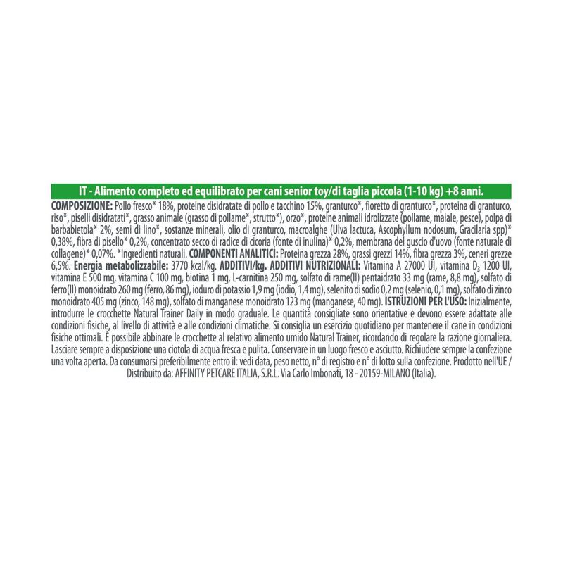 Natural Trainer Small&Toy Mature con Pollo si distingue per l'utilizzo di proteine di alta qualità e ingredienti naturali attentamente selezionati per garantire una nutrizione ottimale per i cani anziani di taglia piccola e toy.