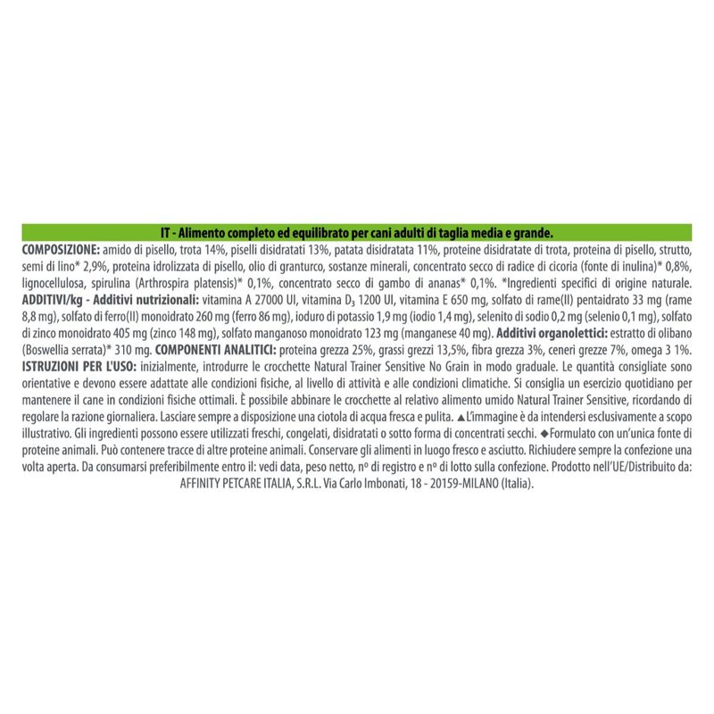 Croccantini per cane Natural Trainer Sensitive No Grain con trota come unica fonte di proteina animale. Ideale per cani di taglia media e grande, con un peso superiore a 11 Kg. Prodotto disponibile nel formato da 3kg e da 12kg.