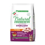 Cibo secco per gatti Natural Trainer Adult Sterilised con Tacchino e Fibra di Pisello. Un alimento completo per gatti sterilizzati con almeno un anno d'età. Ideale anche per gatti pigri o che vivono esclusivamente in casa. Il prodotto ha avuto un rinnovamento, da Carni Bianche diventa Tacchino.