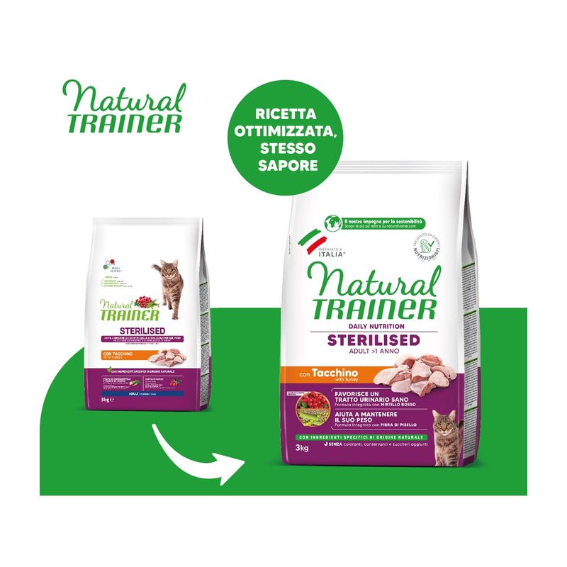 Natural Trainer Gatto Sterilised Tacchino si rinnova con nuovo pack e nuova formulazione. Potresti ricevere il nuovo o il vecchio pack in base alle disponibilità in magazzino.