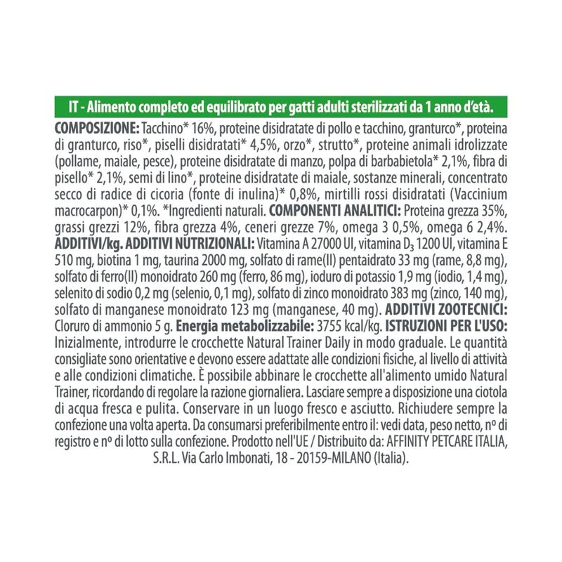 Natural Trainer Gatto Sterilised Tacchino è un alimento secco completo e bilanciato progettato appositamente per gatti sterilizzati di un anno d'età e oltre. Questo cibo secco è formulato per aiutare a mitigare gli effetti della sterilizzazione sul peso del tuo gatto, mantenendo nel contempo la sua forma fisica ideale. La sua formula adattata include fibre vegetali, come la fibra di pisello, e un livello moderato di grassi, che contribuiscono a ridurre il contenuto energetico complessivo del cibo. Questo aiuta a controllare il peso del tuo gatto sterilizzato, evitando eccessivi accumuli di grasso. Questo alimento senza coloranti, conservanti e zuccheri aggiunti contiene il tacchino come fonte di proteina animale di alta qualità e prebiotici di origine naturale, derivati dalla radice di cicoria e dalla polpa di barbabietola, favoriscono la funzionalità intestinale e il corretto equilibrio del microbiota intestinale. Questi componenti favoriscono la funzionalità digestiva, consentendo al tuo gatto di godere di pasti leggeri e facilmente digeribili. Per mantenere la pelle sana e il pelo lucido, questo alimento è arricchito con acidi grassi omega-3, omega-6, biotina e zinco. Questi nutrienti contribuiscono al benessere della pelle e alla bellezza del pelo del tuo gatto, mantenendolo sano e splendente. Inoltre, per preservare la salute delle vie urinarie del tuo felino, questo alimento contiene mirtilli rossi, estratto di radici di cicoria di origine naturale e livelli controllati di sostanze minerali.