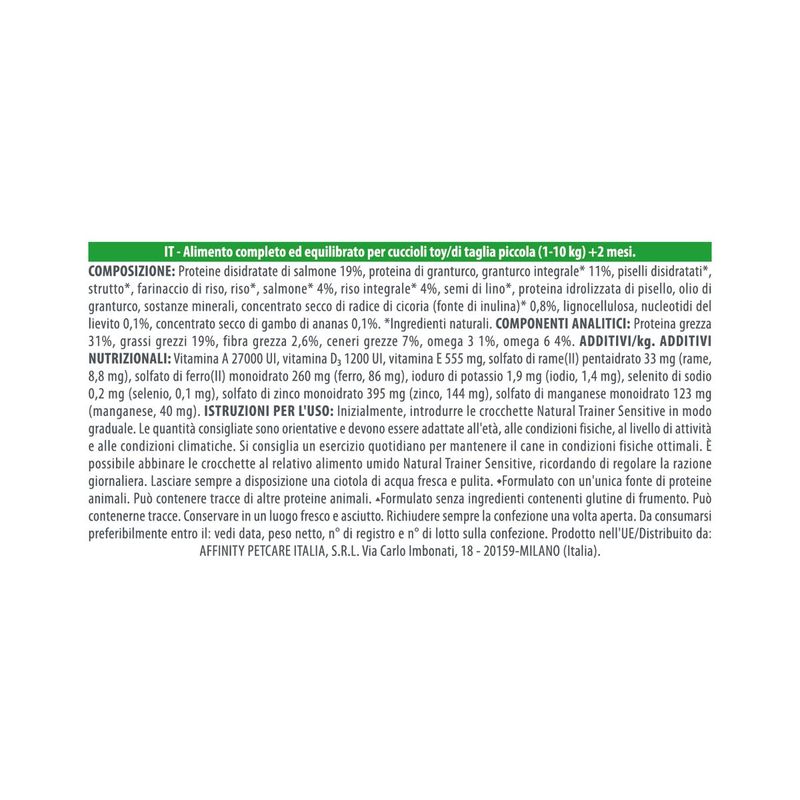 Natural Trainer Sensitive No Gluten Mini Puppy&Junior con Salmone crocchette complete e equilibrate per cuccioli/toy (>2 mesi) di taglia piccola.