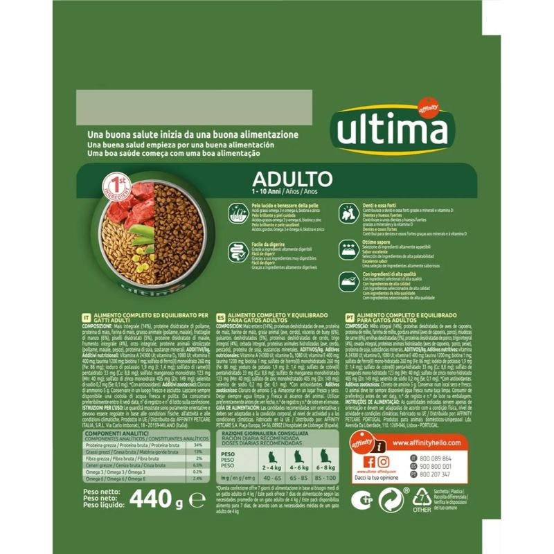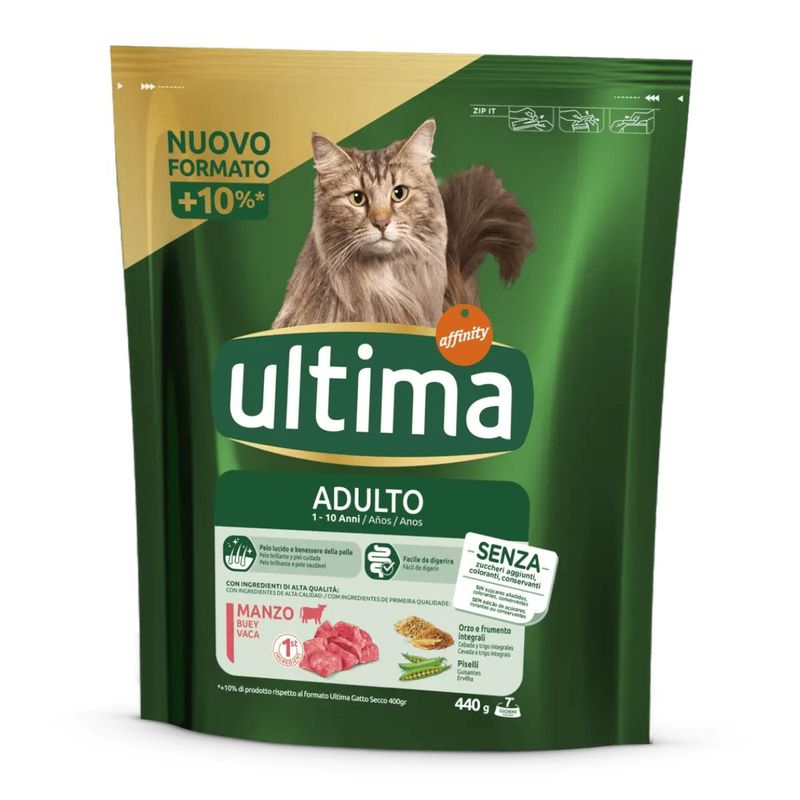 Ultima Cat Manzo Riso è un alimento secco formulato appositamente per gatti adulti, fino ai 10 anni, che si adatta perfettamente alle esigenze nutrizionali dei gatti adulti e che lo aiuterai a mantenersi sano, con un pelo lucente e una pelle in salute. Questo prodotto è studiato per fornire una nutrizione completa e bilanciata, assicurando al tuo gatto tutti i nutrienti necessari per mantenere una salute ottimale. Questo alimento, privo di zuccheri aggiunti, coloranti e conservanti, contiene il manzo come fonte di proteina animale di alta qualità, che fornisce proteine che aiutano a mantenere una buona massa muscolare e preziosi acidi grassi essenziali. Gli ingredienti ad alta digeribilità, come le fibre dalla polpa di barbabietola e dai cereali, promuovono una buona digestione e un'eccellente metabolizzazione dei nutrienti. La combinazione di antiossidanti, fibre dall'effetto prebiotico e acidi grassi Omega-3 aiuta a rafforzare le difese naturali del tuo gatto, contribuendo a mantenere uno stato di salute ottimale. Mentre, la presenza di acidi grassi Omega-3 e Omega-6, insieme allo zinco, contribuisce a mantenere la pelle e il pelo del tuo gatto splendenti e sani. Inoltre, il calcio, il fosforo e la vitamina D favoriscono la formazione di ossa solide e denti forti.