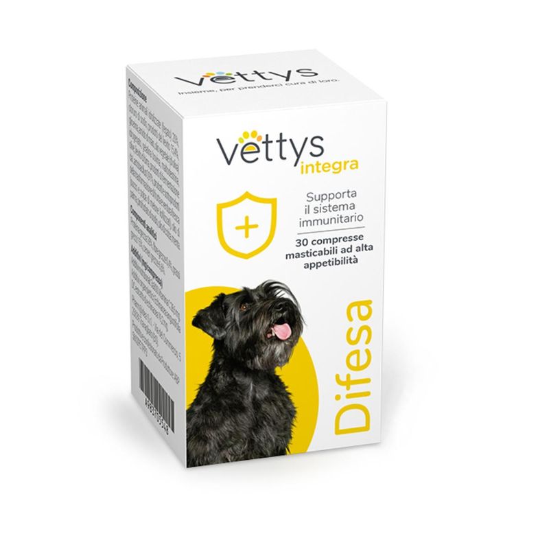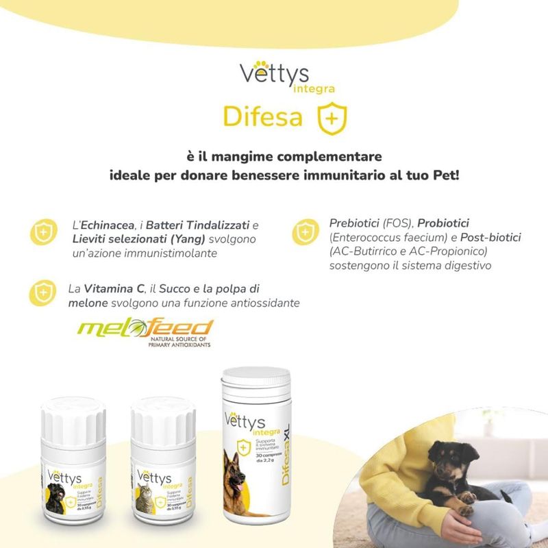 Vettys Integra Difesa Mangime Complementare per Cani è un mangime complementare multivitaminico, specificamente formulato per supportare il corretto funzionamento del sistema immunitario del tuo cane. Questo prodotto viene fornito in comode compresse masticabili, altamente appetibili, ideate per una facile somministrazione, rendendo più semplice la cura del tuo amico a quattro zampe. Tra gli ingredienti principali troviamo l'Echinacea, un estratto naturale noto per le sue proprietà immunostimolanti e immunomodulanti. Questo potente ingrediente aiuta a rafforzare le difese naturali dell'organismo del tuo cane, sostenendo un sistema immunitario sano e reattivo. Il prodotto contiene anche lieviti selezionati e altamente purificati, che stimolano il sistema immunitario associato all’intestino. Questi lieviti sono in grado di legare i patogeni, riducendo la loro capacità di aderire all’intestino e prevenendo così possibili disturbi intestinali. In aggiunta, questo prodotto include prodotti di fermentazione, cellule innatine di lattobacilli che mantengono inalterata la loro struttura cellulare. Questa caratteristica consente un dosaggio preciso e garantisce la capacità di aderire agli enterociti, promuovendo l'immunità intestinale e competendo con i patogeni per i siti di adesione epiteliale liberi. Infine, la presenza di Vitamina C come antiossidante naturale contribuisce a proteggere le cellule del tuo cane dai danni dei radicali liberi, supportando ulteriormente la salute del suo sistema immunitario.