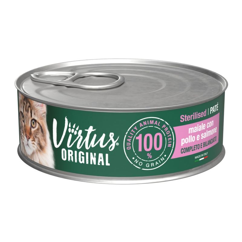VIrtus Cat Sterilized Paté Lattina Multipack 12x85G è un alimento umido in lattina, creato con cura in Italia, questo pregiato paté offre una combinazione completa e bilanciata di nutrienti essenziali, ideale per la dieta quotidiana del tuo gatto adulto sterilizzato. Questo alimento senza cereali, conservanti e coloranti artificiali, contiene carne o pesce come fonte di proteina animale di alta qualità e offre al tuo gatto un pasto che rispecchia la qualità e l'attenzione alla salute che si trovano solo nei prodotti italiani. Questo paté soddisferà il palato del tuo felino, mentre lo nutrirà con gli elementi essenziali per mantenerlo in salute e pieno di vitalità. Confezionato in pratiche lattine da 85G, questo multipack offre una varietà di sapori irresistibili che renderanno l'esperienza alimentare del tuo gatto più interessante e appagante.