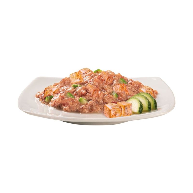 • Ragù gustoso con cubetti visibili di carne o pesce e verdure selezionate.
