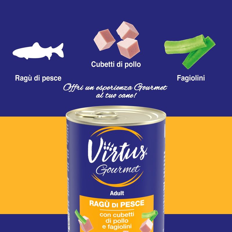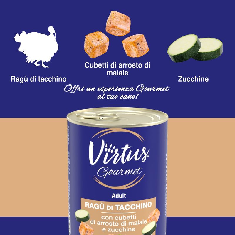 Sorprendi ogni giorno il tuo cane con un pasto da veri intenditori: scegli Virtus Dog Gourmet Lattina 400G e porta in ciotola tutto il gusto di una cucina fatta con amore!