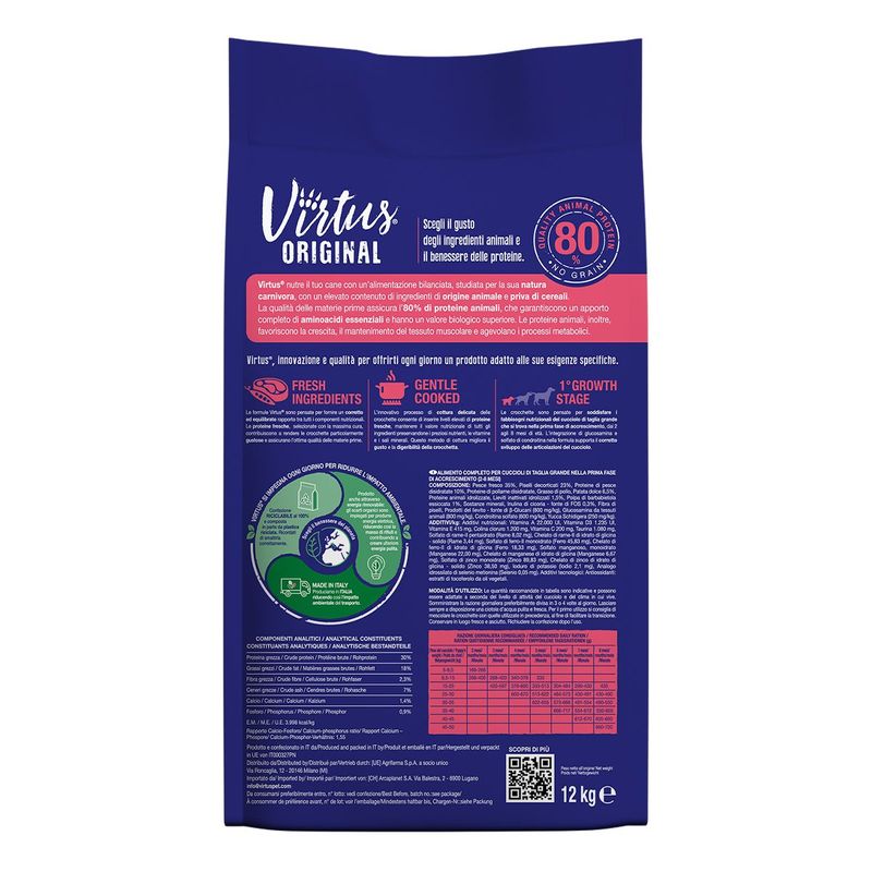 Virtus Dog Large Puppy Dive Formula offre un’alimentazione secca completa e bilanciata e specificamente studiata per rispettare la natura carnivora del tuo cane, garantendo un elevato contenuto di ingredienti di origine animale e l’assenza di cereali nella formulazione. Grazie alla qualità delle materie prime utilizzate, questo alimento assicura un apporto di proteine animali pari all’80%, fondamentali per fornire aminoacidi essenziali con un proteine ad alto valore biologico. Le proteine animali presenti nelle crocchette favoriscono la crescita e il mantenimento del tessuto muscolare, oltre a supportare efficacemente i processi metabolici del tuo cane. Le crocchette sono realizzate con un innovativo processo di cottura delicata, che permette di includere livelli elevati di proteine fresche e di preservare il valore nutrizionale degli ingredienti. Questo metodo consente di mantenere intatti i preziosi nutrienti, come vitamine e sali minerali, migliorando al contempo il gusto e la digeribilità del prodotto.