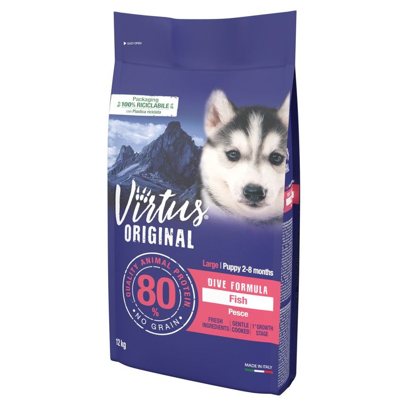 Affidati a Virtus Dog Large Puppy Dive Formula per garantire al tuo amico a quattro zampe, una dieta gustosa, nutriente e bilanciata, che supporta il suo benessere generale e la sua vitalità. Dai al tuo cane il meglio fin da subito con Virtus.