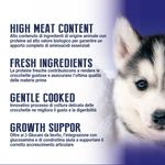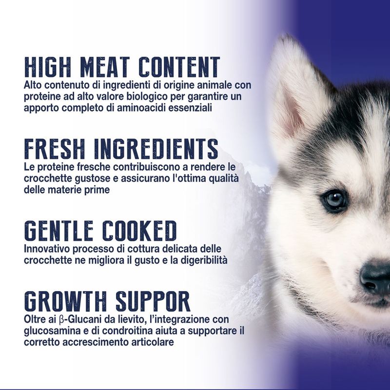 Le crocchette sono pensate per soddisfare i fabbisogni nutrizionali del cucciolo di taglia grande che si trova nella prima fase di accrescimento, dai 2 agli 8 mesi di età. L'integrazione di glucosamina e solfato di condroitina nella formula supporta il corretto sviluppo delle articolazioni del cucciolo. Le proteine fresche, selezionate con cura, rendono il prodotto particolarmente gustoso e confermano l’eccellenza delle materie prime impiegate, garantendo un alimento completo e privo di cereali, perfetto per soddisfare le esigenze specifiche del tuo cane.