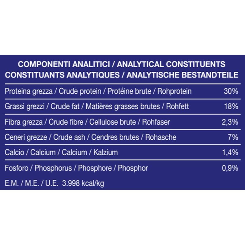 • Contiene l'80% di proteine animali di qualità, ricche di aminoacidi essenziali e con proteine ad alto valore biologico..