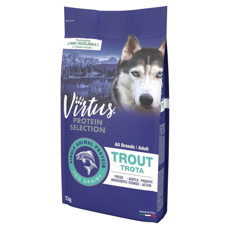 Attenzione: Virtus Dog Protein Selection Adult Trota No Grain si rinnova con nuovo packaging e nuova formulazione. Potresti ricevere la nuova o la vecchia formula a seconda della disponibilità a magazzino.