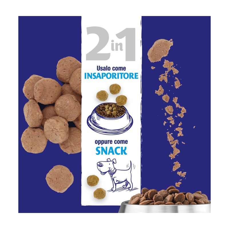 Virtus Dog Raw Snack Insaporitore Freeze Dried Pops 30G è uno snack o insaporitore naturale, grain-free, pensato per aggiungere un tocco di bontà e nutrizione alle crocchette del tuo cane. Realizzato con ingredienti selezionati e un alto contenuto di carne, questo prodotto è perfetto per cani di tutte le età. La liofilizzazione (metodo di "freeze drying") è un processo innovativo che elimina l’acqua dall’alimento, preservando al massimo le sostanze nutritive e il gusto naturale della carne, offrendo un'esperienza di gusto autentico che il tuo cane adorerà. Ogni boccone è un concentrato di nutrimento che può essere usato come spuntino o aggiunto alle crocchette, per una dieta completa e gustosa.