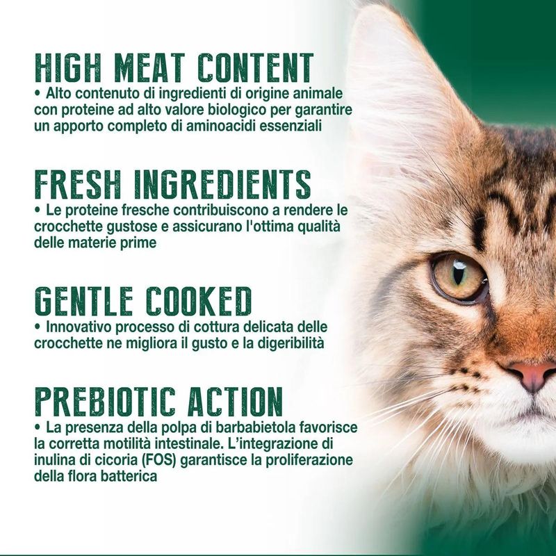 • Contiene un’alta percentuale di carne di pollo, come fonte di proteina animale.