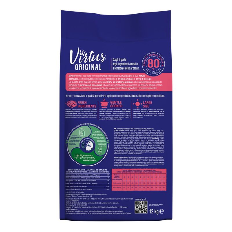 Affidati a Virtus Dog Large Adult Dive Formula per garantire al tuo amico a quattro zampe, una dieta gustosa, nutriente e bilanciata, che supporta il suo benessere generale e la sua vitalità. Dai al tuo cane il meglio fin da subito con Virtus.