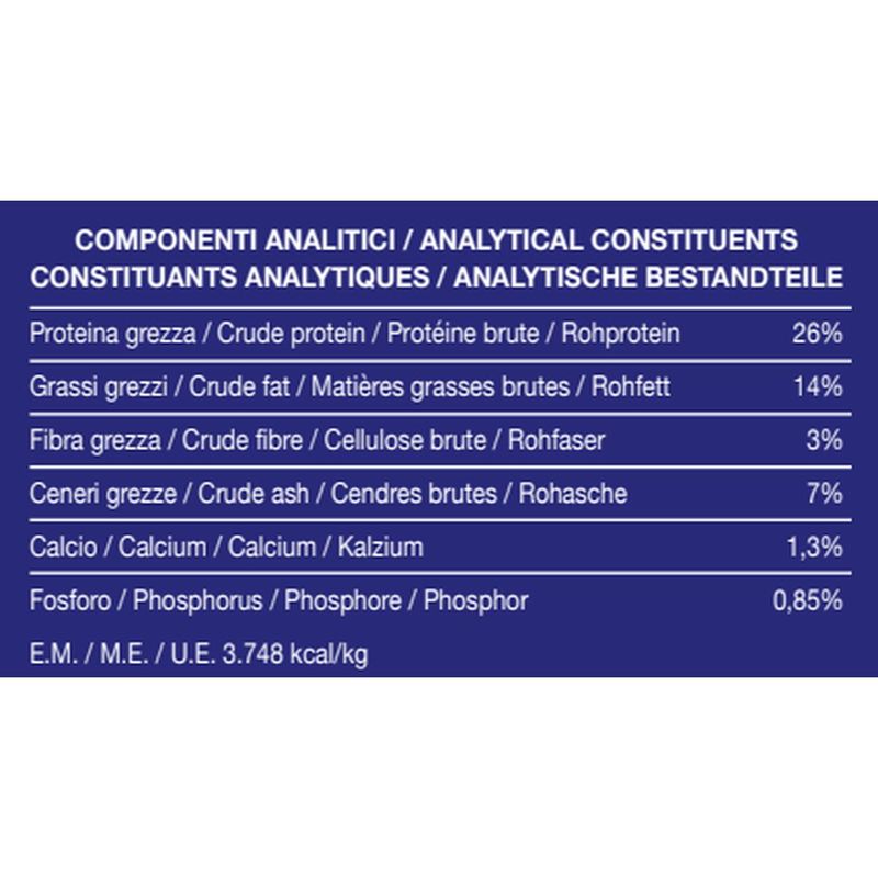 • Contiene l'80% di proteine animali di qualità, ricche di aminoacidi essenziali e con proteine ad alto valore biologico.
