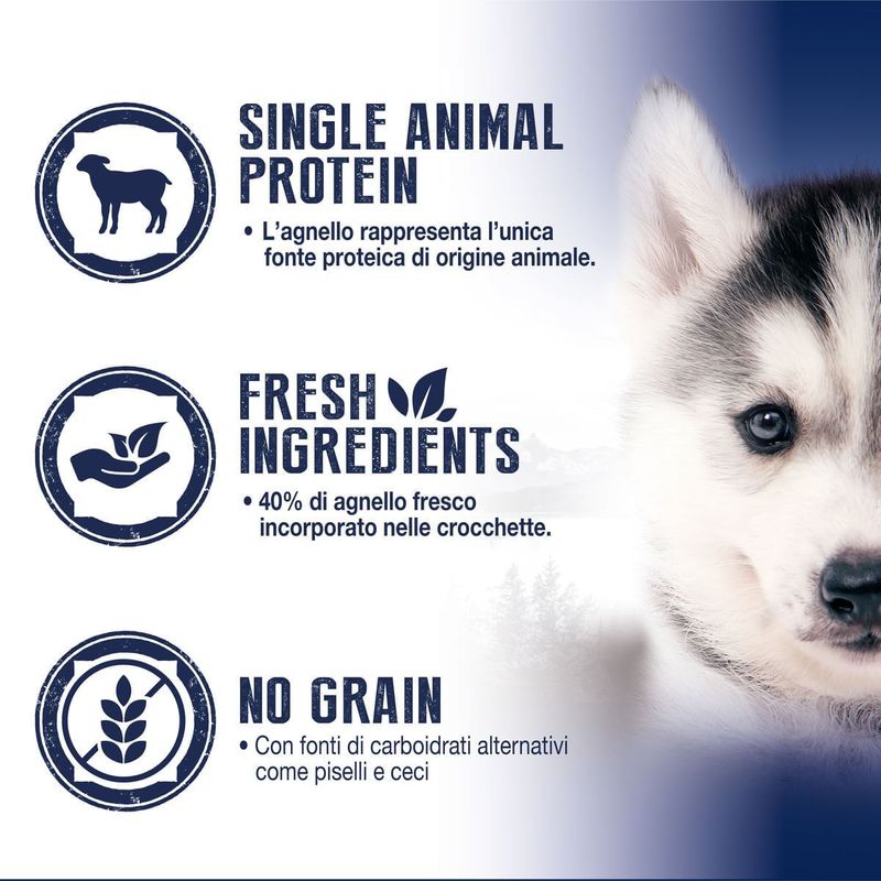 N.B. Il prodotto si presenta in formato busta da 2KG o 7,5KG al gusto Agnello.