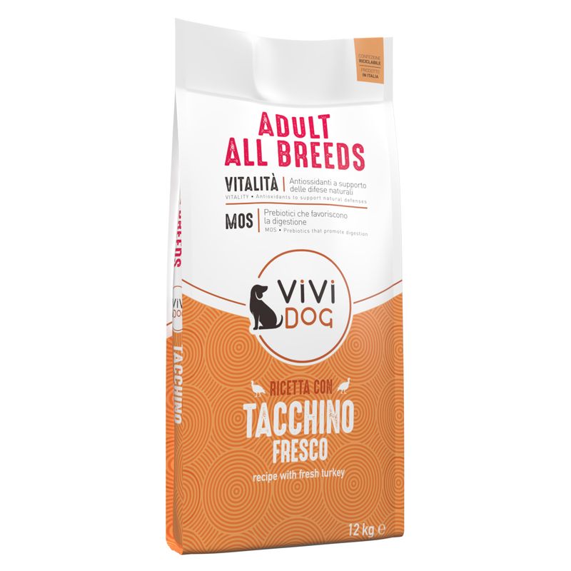 Vivi Dog Adult All Breeds con Tacchino è un alimento secco appositamente creato per soddisfare al 100% i bisogni nutrizionali dei cani adulti di tutte le taglie e razze, fin dai loro primi mesi di vita. Con Vivi Dog, offri al tuo amico a quattro zampe non solo un pasto, ma un vero e proprio sostegno per una vita piena di vitalità e salute. Orgogliosamente prodotto in Italia, ogni croccantino di Vivi Dog è una garanzia di qualità e sicurezza per il tuo cane. Questo alimento contiene il tacchino fresco come fonte di proteina animale di alta qualità ed è arricchito con glucosamina e solfato di condroitina, due componenti essenziali per il sostegno delle articolazioni del tuo cane, garantendogli un'attività fisica confortevole e senza problemi. La formula di questo alimento include anche un mix di alghe naturali, un tesoro di nutrienti che non solo mantiene il pelo del tuo cane forte e lucente, ma contribuisce anche al suo benessere generale. Inoltre, contiene contiene antiossidanti per sostenere le difese naturali del tuo animale e M.O.S., prebiotici che favoriscono una digestione sana e equilibrata.