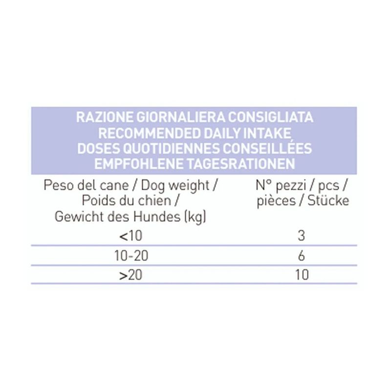 Grazie alla loro consistenza, i Mini Bones sono ideali da somministrare come spuntino tra i pasti o come ricompensa durante l’addestramento, motivando il tuo cane in modo gustoso e sano. La qualità degli ingredienti e il processo di cottura artigianale li rendono un’opzione sicura e appetitosa, che il tuo cane adorerà. Perfetti per essere consumati in qualsiasi momento della giornata, questi snack sono un’ottima scelta per premiare il tuo pet con qualcosa di veramente speciale. I biscotti hanno una dimensione di 2x2 cm, progettata appositamente per adattarsi perfettamente alla bocca dei cani di taglia piccola, offrendo un'esperienza di masticazione comoda e soddisfacente.
