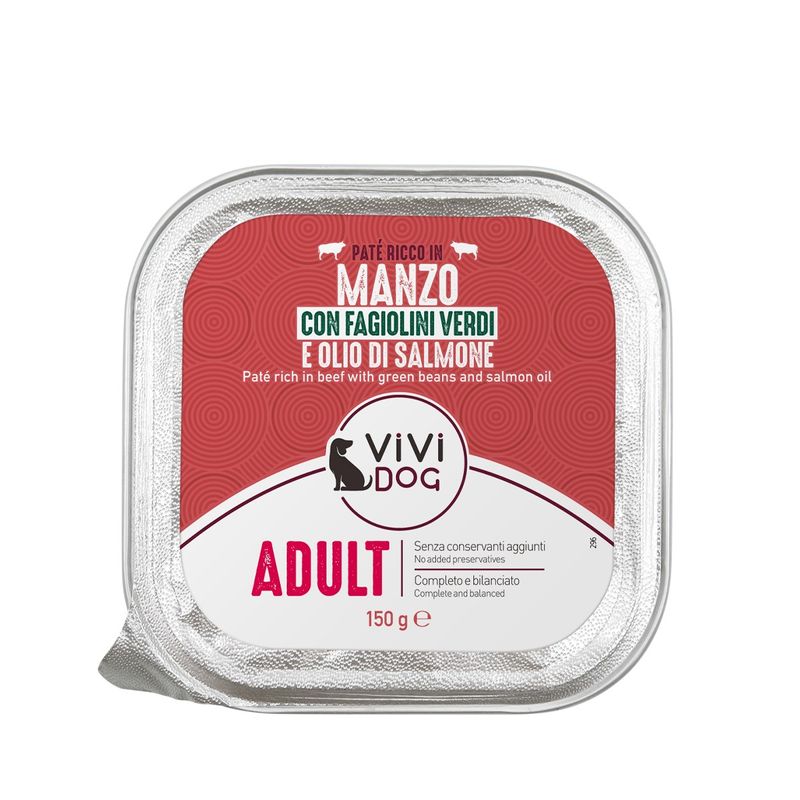 N.B. Il prodotto è disponibile in formato vaschetta multipack da 12x150G nei gusti a scelta tra: Manzo con Fagiolini, Manzo, Pollo e Prosciutto, Salmone, Selvaggina, Tacchino e Manzo.
