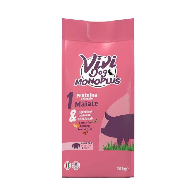 Scopri ViViDog MonoPlus Medium&Maxi Adult Maiale, alimento secco pensato per cani adulti di taglia media e grande. La formula è basata su una sola proteina animale – il maiale – altamente digeribile e ideale per cani con sensibilità alimentari. La ricetta è arricchita con rosmarino, curcuma, semi di lino, chiodi di garofano, buccia di limone e polpa di barbabietola, ingredienti funzionali che aiutano a rafforzare le difese immunitarie, proteggere dai radicali liberi, migliorare la digestione, mantenere il pelo folto e lucente e apportare vitamina C e fibre solubili e insolubili. La presenza di condroitina e glucosamina garantisce un ottimo supporto articolare, fondamentale per mantenere il tuo cane attivo e in salute. Il tutto in una formula senza coloranti né conservanti, perfetta per un’alimentazione quotidiana sicura e bilanciata.