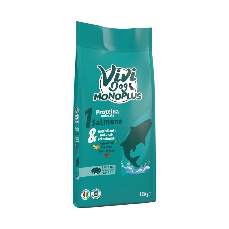 Scopri ViViDog MonoPlus Medium&Maxi Adult Salmone, un alimento secco formulato per cani adulti di taglia media e grande. La sua composizione con una sola fonte proteica animale, il salmone, è ideale per garantire digeribilità e gusto, anche nei soggetti più delicati. Il salmone fresco, ricco di Omega 3 e 6, contribuisce al benessere della pelle e del pelo, mentre ingredienti naturali selezionati come rosmarino, curcuma, semi di lino, chiodi di garofano, buccia di limone e polpa di barbabietola aiutano a rafforzare le difese immunitarie, sostenere la digestione e combattere i radicali liberi. La presenza di glucosamina e condroitina assicura un prezioso supporto per la salute articolare, essenziale per i cani più attivi. Il tutto in una formula senza coloranti né conservanti, per un’alimentazione pulita, genuina e completa.