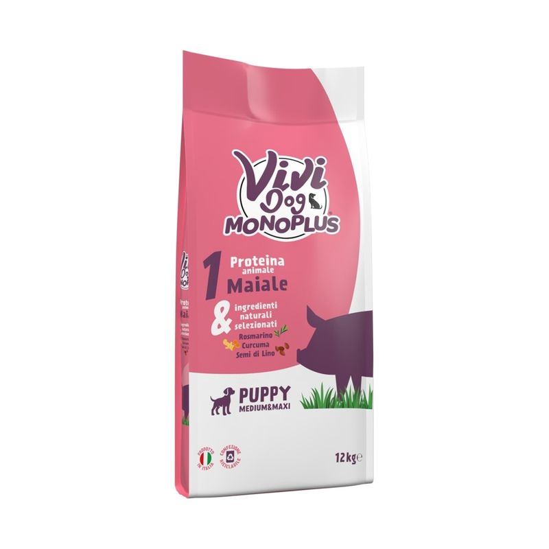 Dai al tuo cucciolo un inizio di vita scattante e gustoso con ViViDog MonoPlus Medium&Maxi Puppy Maiale... la sua energia ti sorprenderà ogni giorno!