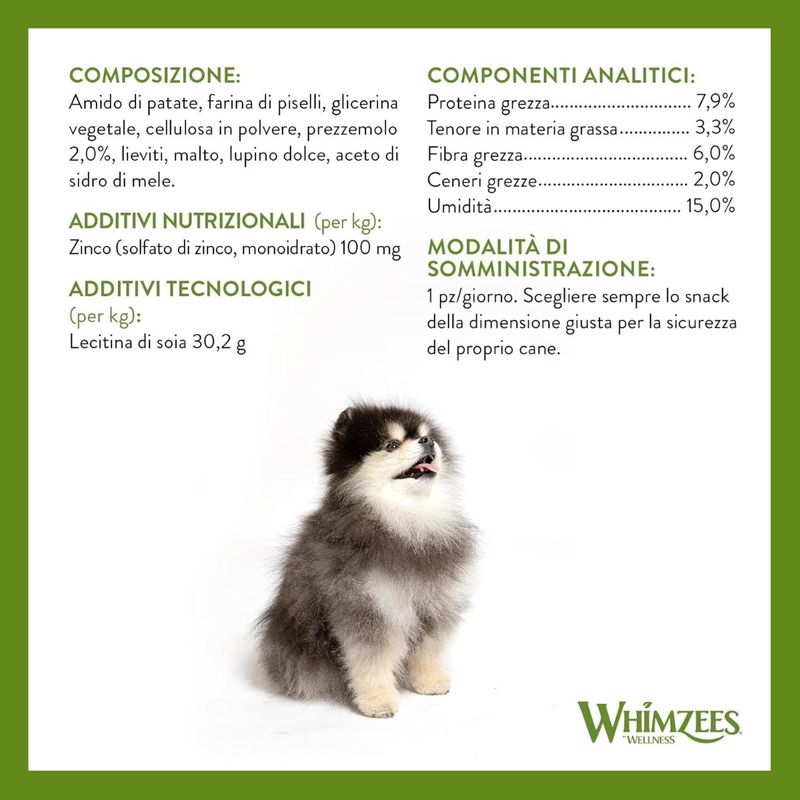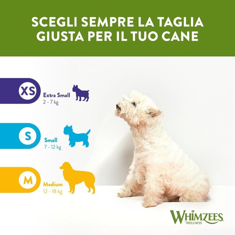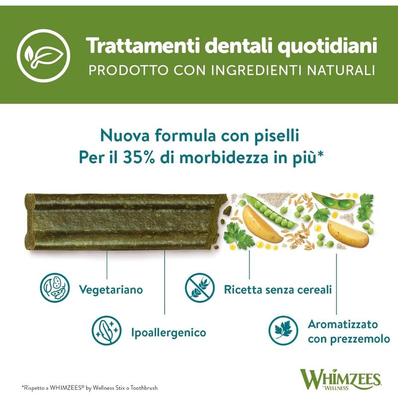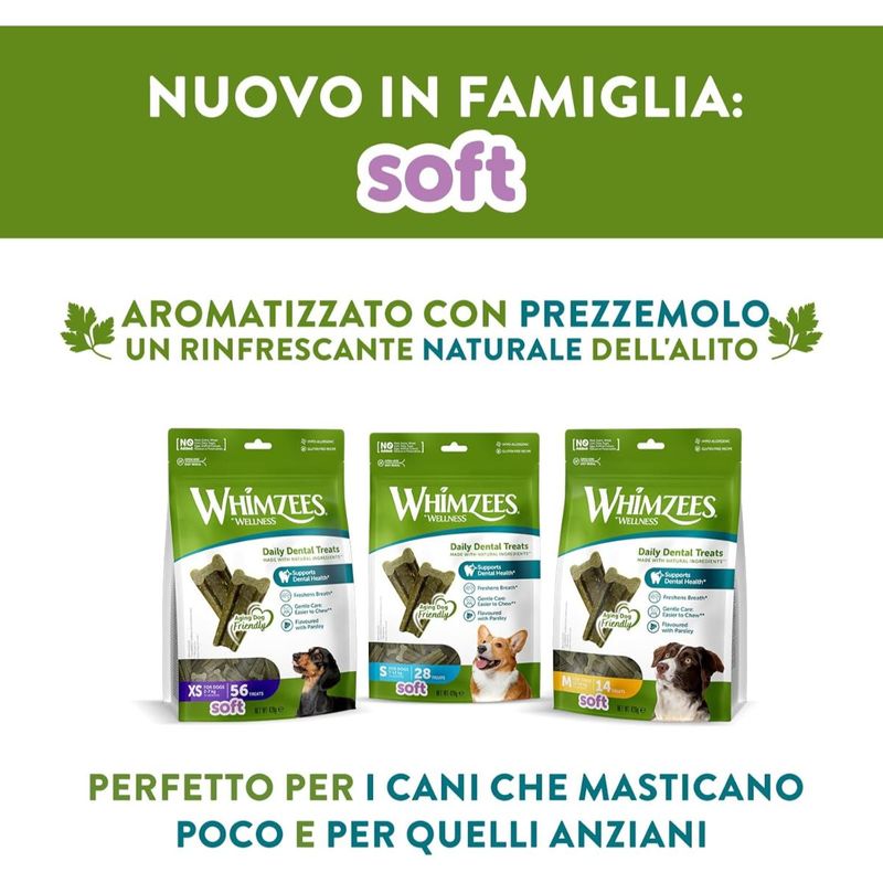 Scegli Whimzees Wellness Dog Daily Dental Treats Soft 420G, uno snack quotidiano gustoso e benefico, pensato per il benessere del tuo amico a quattro zampe, anche nella fase più delicata della sua vita.