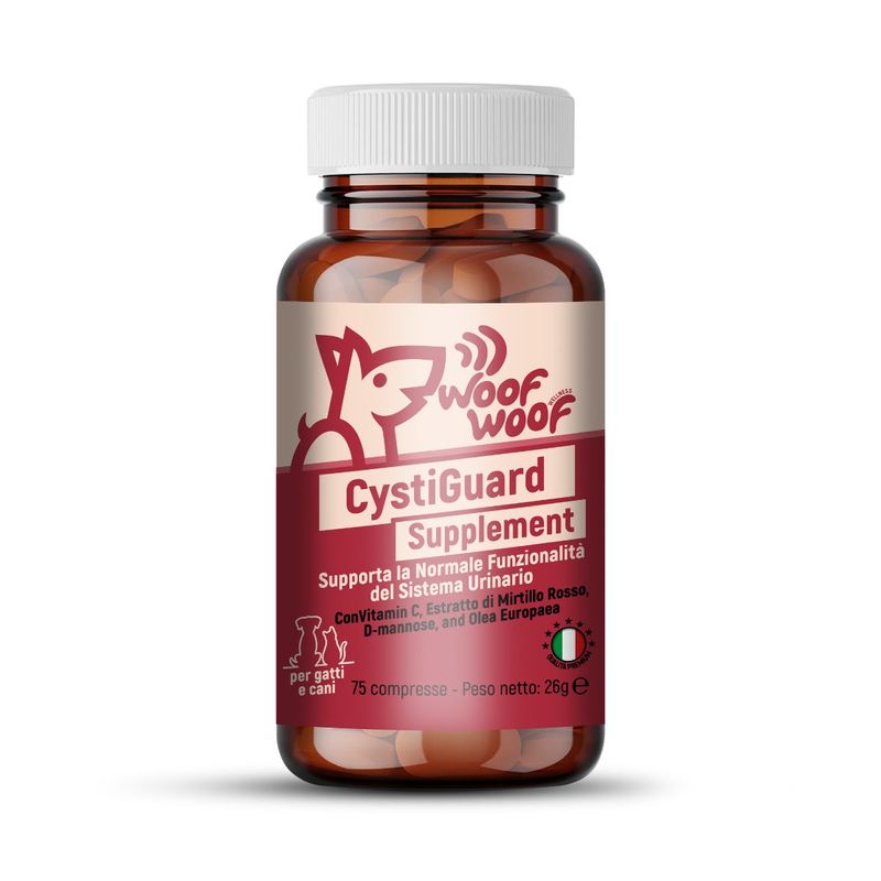 CystiGuard Supplement è un complemento alimentare in compresse per cani e gatti, formulato con Vitamina C, Mirtillo Rosso, D-Mannosio e Olea Europaea per supportare la salute del sistema urinario e favorire il benessere delle vie urinarie.