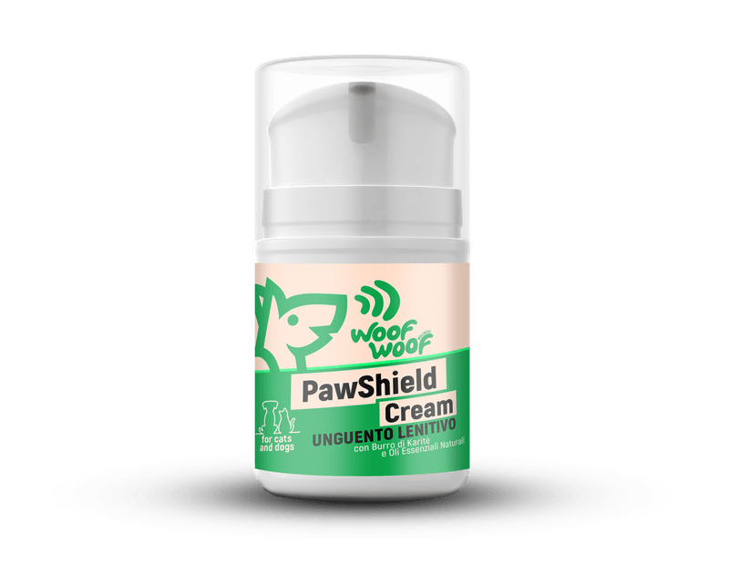 Woof Woof PawShield Cream è una crema lenitiva per zampe e pelle danneggiata di cani e gatti, arricchita con Burro di Karité, Oli Essenziali Naturali, Aloe Vera e Glutatione.