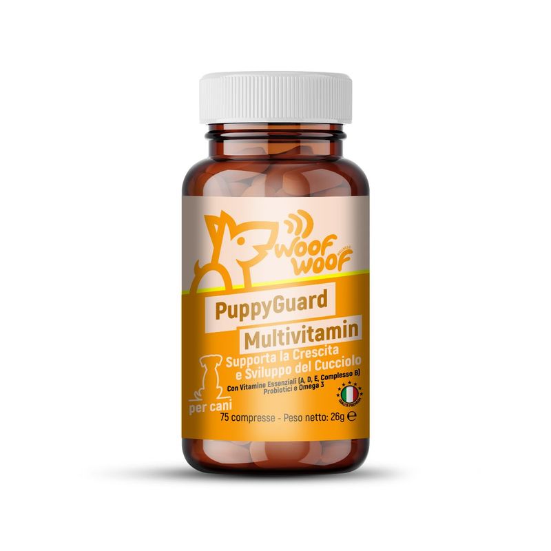 Woof Woof PuppyGuard Multivitamin è un complemento alimentare completo per cuccioli di cani, arricchito con vitamine essenziali, probiotici e Omega-3.