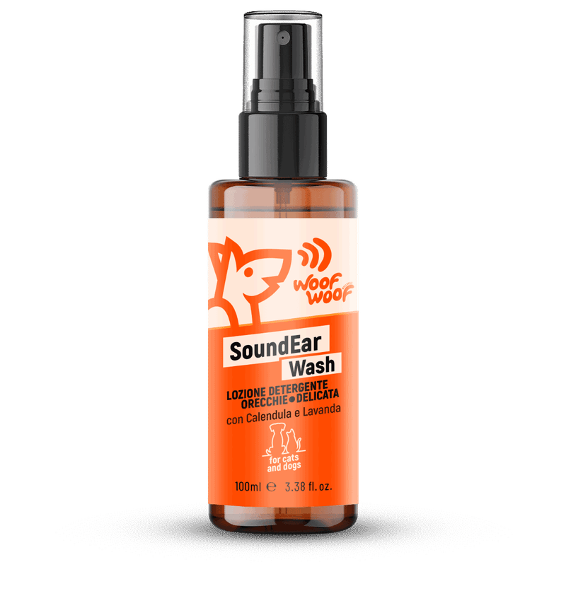 Woof Woof SoundEar Wash è la soluzione ideale per mantenere le orecchie del tuo cane o gatto pulite, libere da cerume e irritazioni, proteggendo la salute del suo udito.