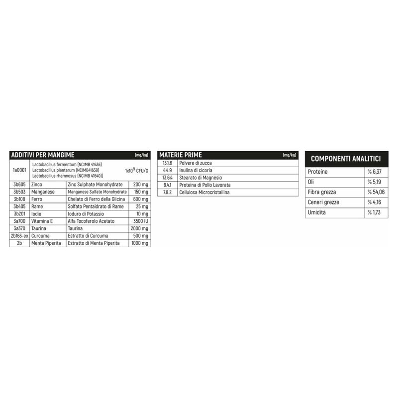 • Probiotici: Lactobacillus fermentum, plantarum, rhamnosus (1x10⁹ CFU/g) → Equilibrano la flora intestinale e migliorano l’assimilazione dei nutrienti.