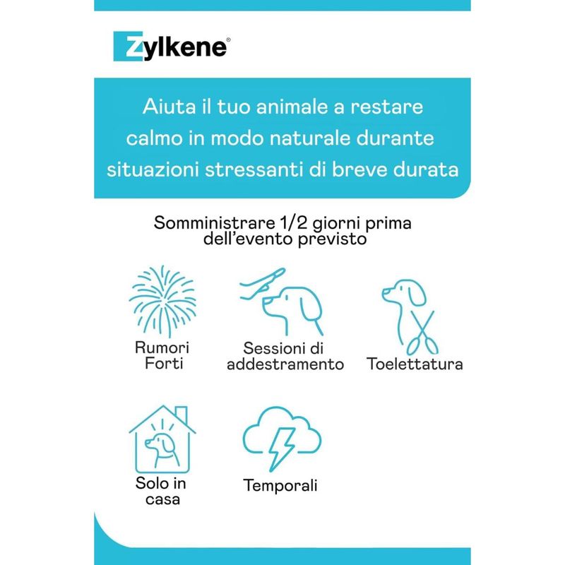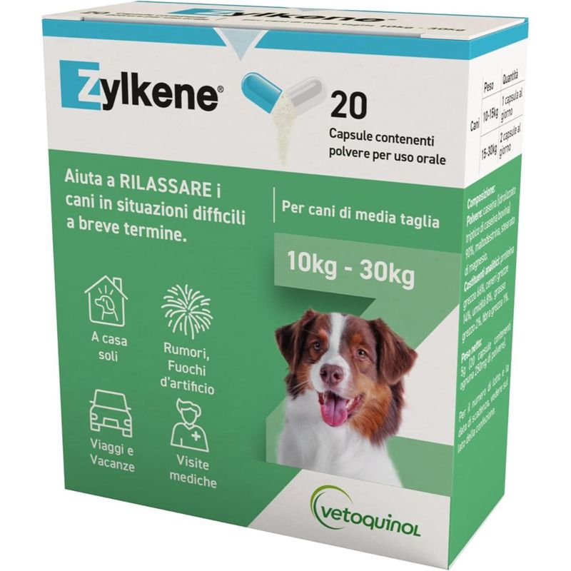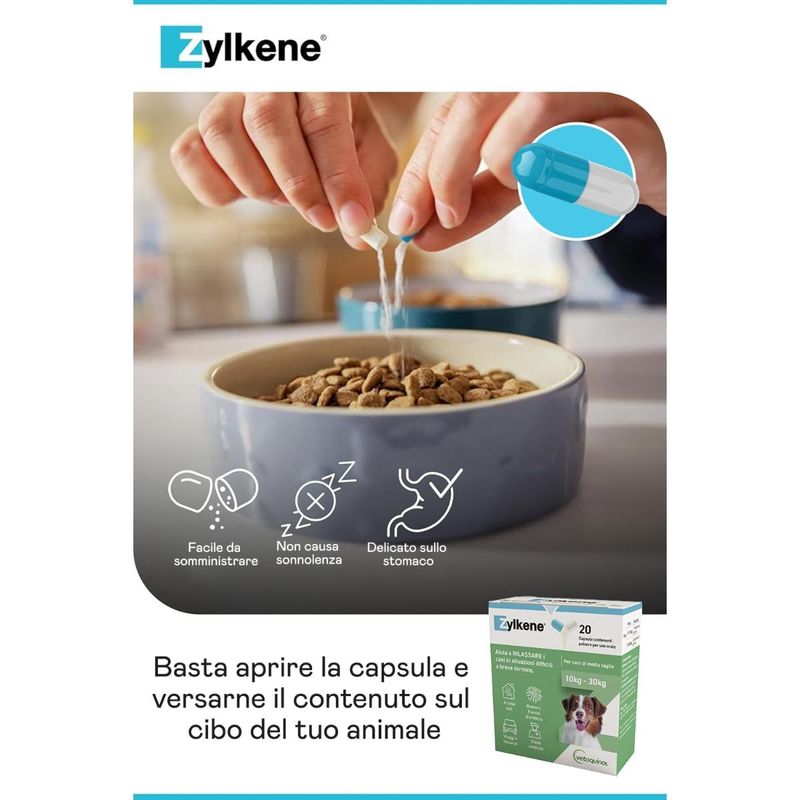 Il Zylkene Rilassante Cani 225MG è un mangime complementare naturale per cani di taglia media (10–30 kg), pensato per aiutare il tuo amico a quattro zampe a mantenere uno stato di calma durante situazioni difficili di breve durata. Contiene un ingrediente di origine naturale derivato dalla caseina, una proteina del latte che favorisce un effetto rilassante senza causare sonnolenza o alterazioni del comportamento. È ideale da somministrare in previsione di eventi stressanti come rumori forti (fuochi d’artificio, temporali), viaggi, toelettatura, sessioni di addestramento, visite veterinarie o periodi in cui il cane resta solo in casa. Le capsule, contenenti polvere appetibile, possono essere aperte e mescolate facilmente al cibo o a uno snack. Si consiglia di iniziare la somministrazione 1–2 giorni prima dell’evento previsto (fino a 5–7 giorni nei casi più sensibili). Zylkene è ben tollerato e adatto anche per lunghi periodi d’uso, se necessario sotto consiglio veterinario. Non è un farmaco, non ha effetti collaterali ed è sicuro anche per cuccioli e cagne in allattamento.