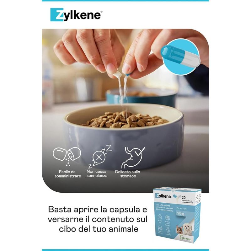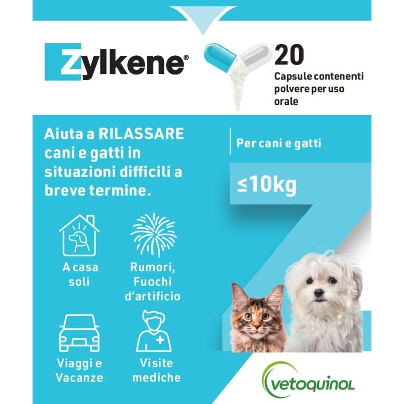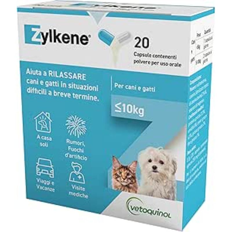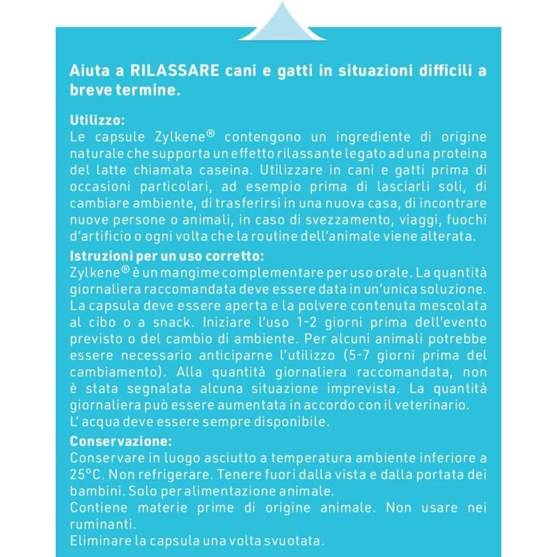 Il Zylkene Rilassante per Cani e Gatti 75MG è un mangime complementare naturale ideale per cani e gatti di piccola taglia (fino a 10 kg), utile per aiutare i pet a mantenere la calma durante situazioni difficili o stressanti di breve durata. La sua formula contiene un ingrediente di origine naturale derivato dalla caseina, una proteina del latte nota per le sue proprietà rilassanti. Questo principio attivo agisce in modo sicuro e delicato, senza causare sonnolenza o alterare il comportamento dell’animale. È indicato in diverse situazioni di disagio come rumori forti (fuochi d’artificio, temporali), viaggi e spostamenti, sessioni di toelettatura o addestramento, visite veterinarie oppure periodi in cui l’animale resta solo in casa. Le capsule, contenenti polvere appetibile, possono essere facilmente aperte e mescolate al cibo o a uno snack. Si consiglia di somministrare Zylkene 1–2 giorni prima dell’evento previsto (o fino a 5–7 giorni in caso di animali particolarmente sensibili). Delicato sullo stomaco e di facile somministrazione, Zylkene 75mg è ben tollerato anche da cuccioli e gattini, non contiene sostanze dopanti e può essere utilizzato in modo continuativo o temporaneo, sempre secondo indicazione veterinaria.
